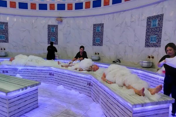 It begins with a sauna, where the heat deeply purifies your body, relaxing muscles, and improving circulation. Following that is the Turkish bath, where you'll enjoy the steamy atmosphere that clears your respiratory passages and soothes the skin.